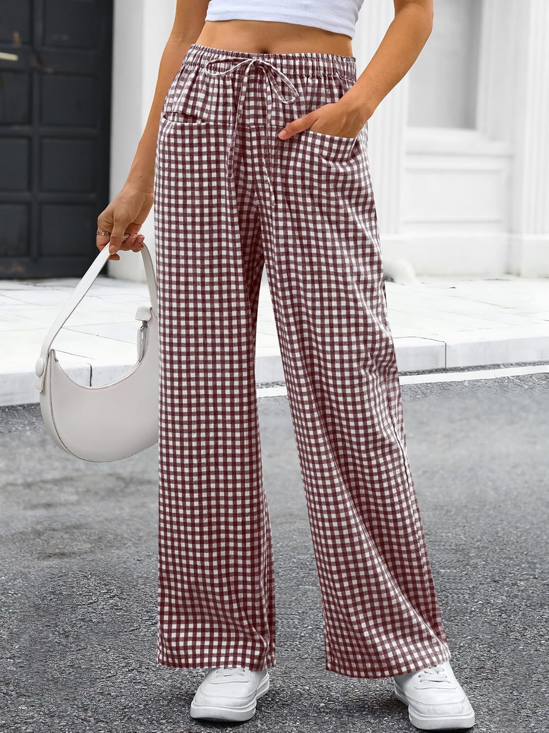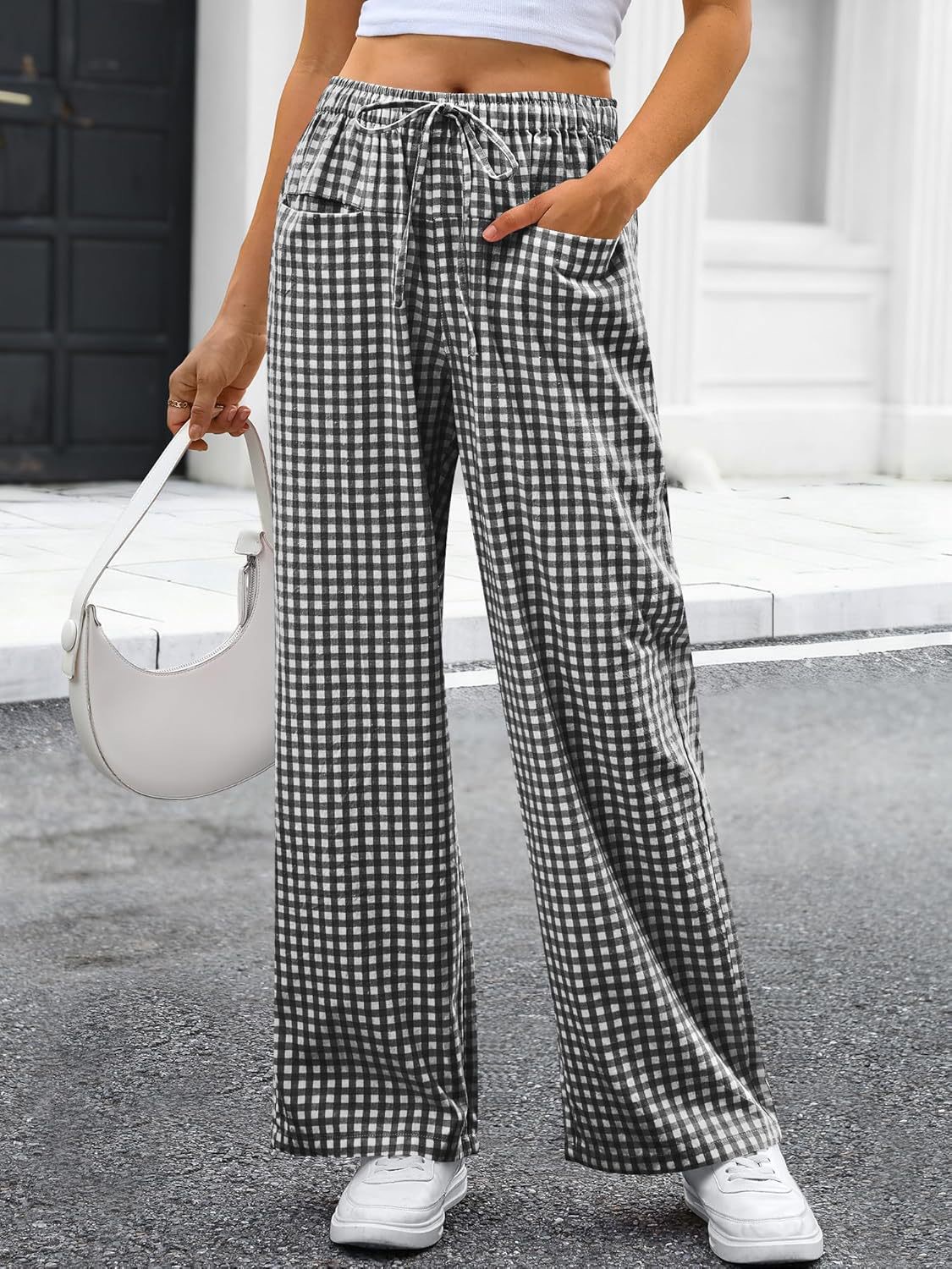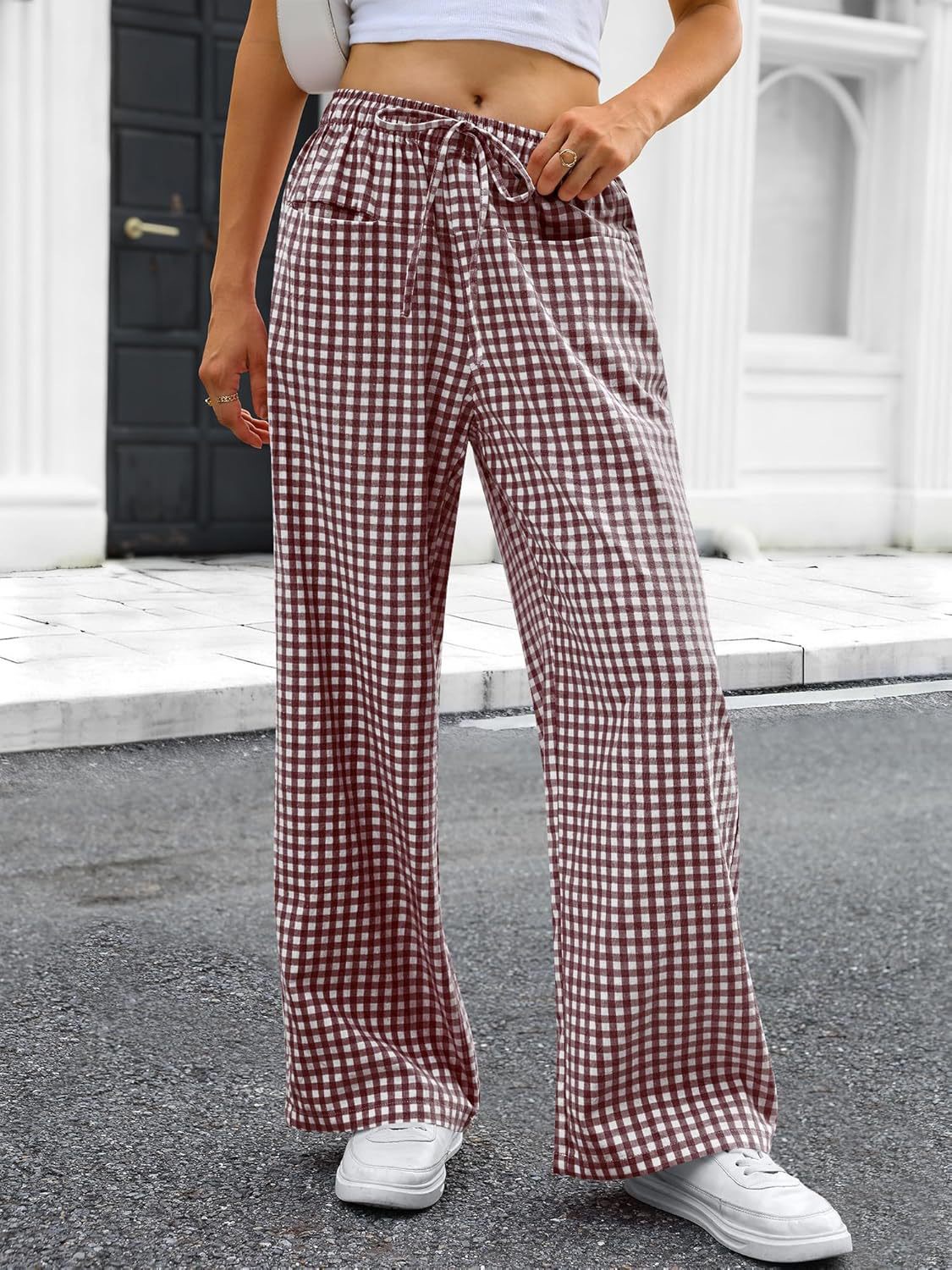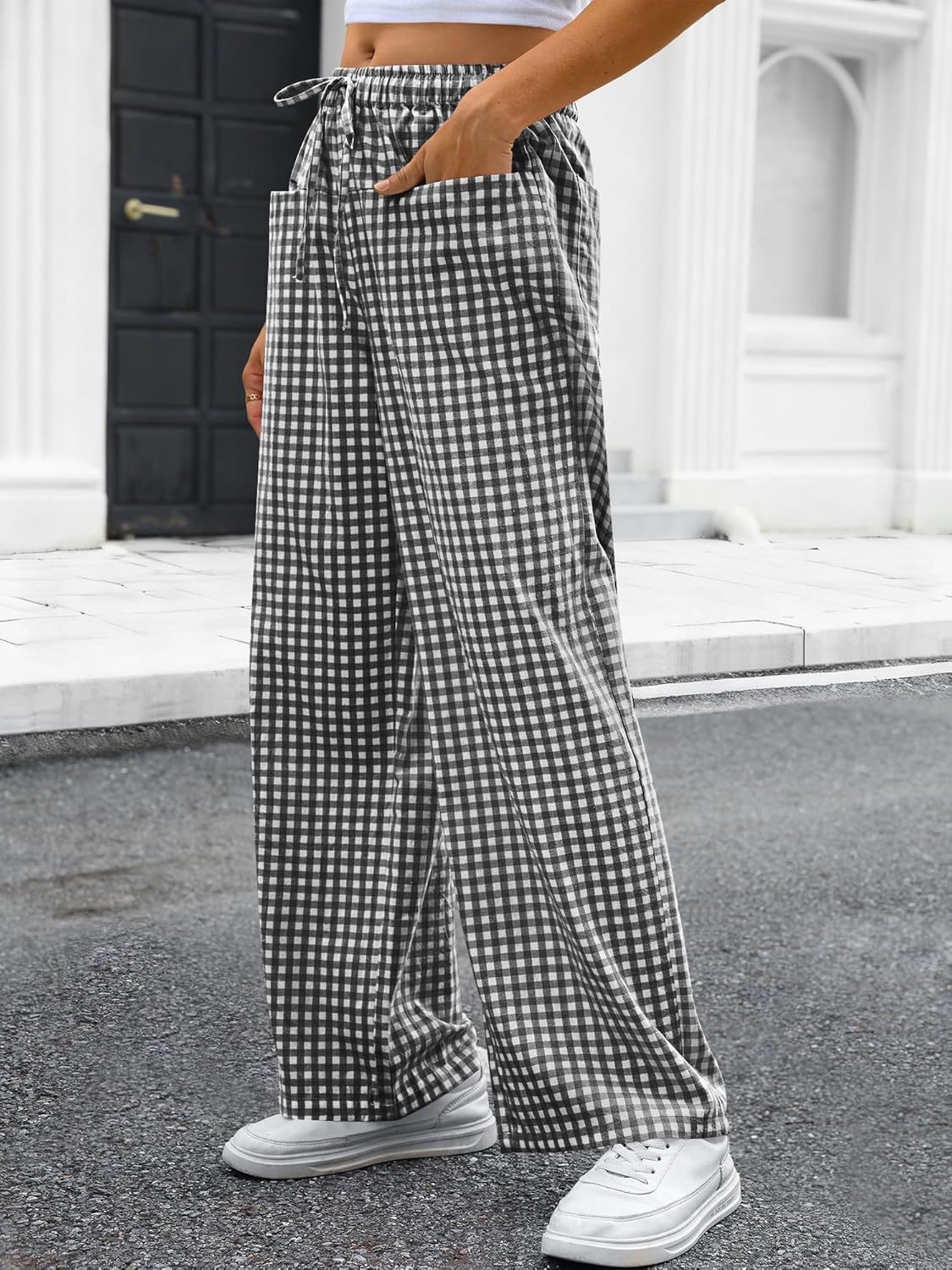 High-waisted Wide-leg Plaid Drawstring Loungeleisure Pants