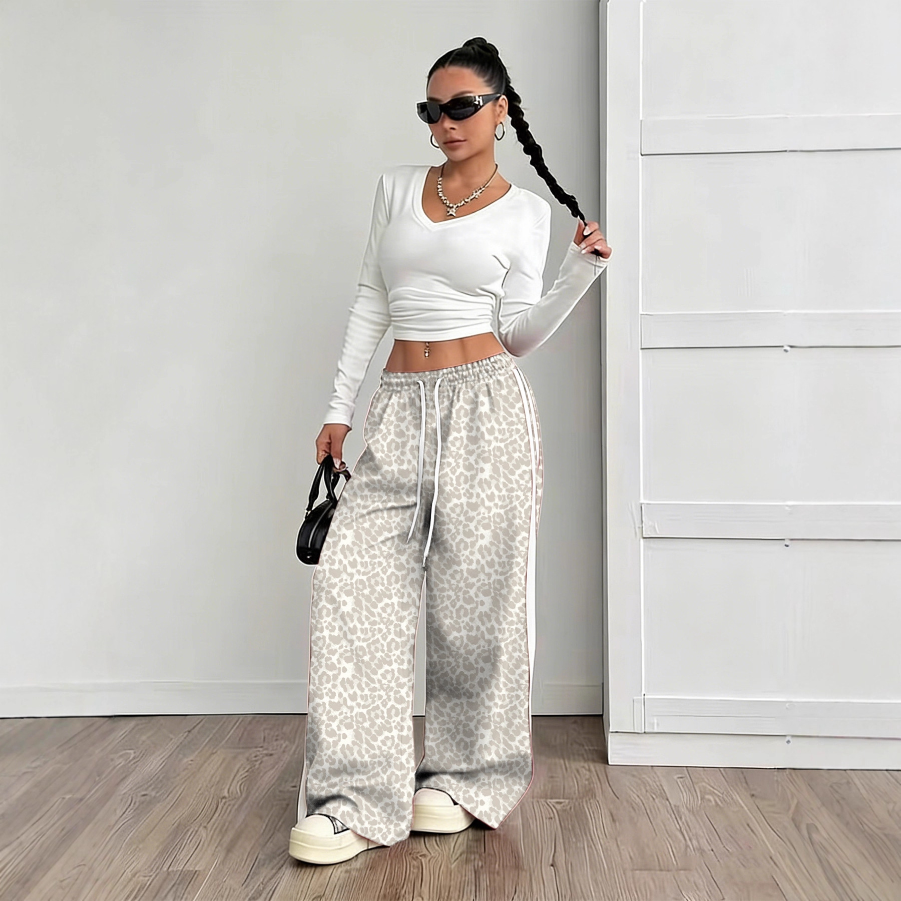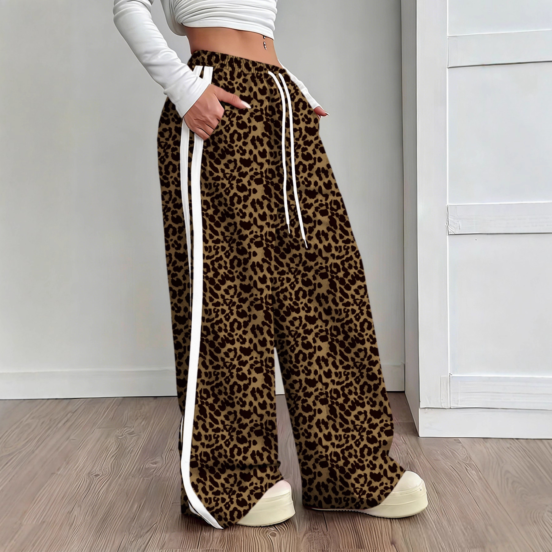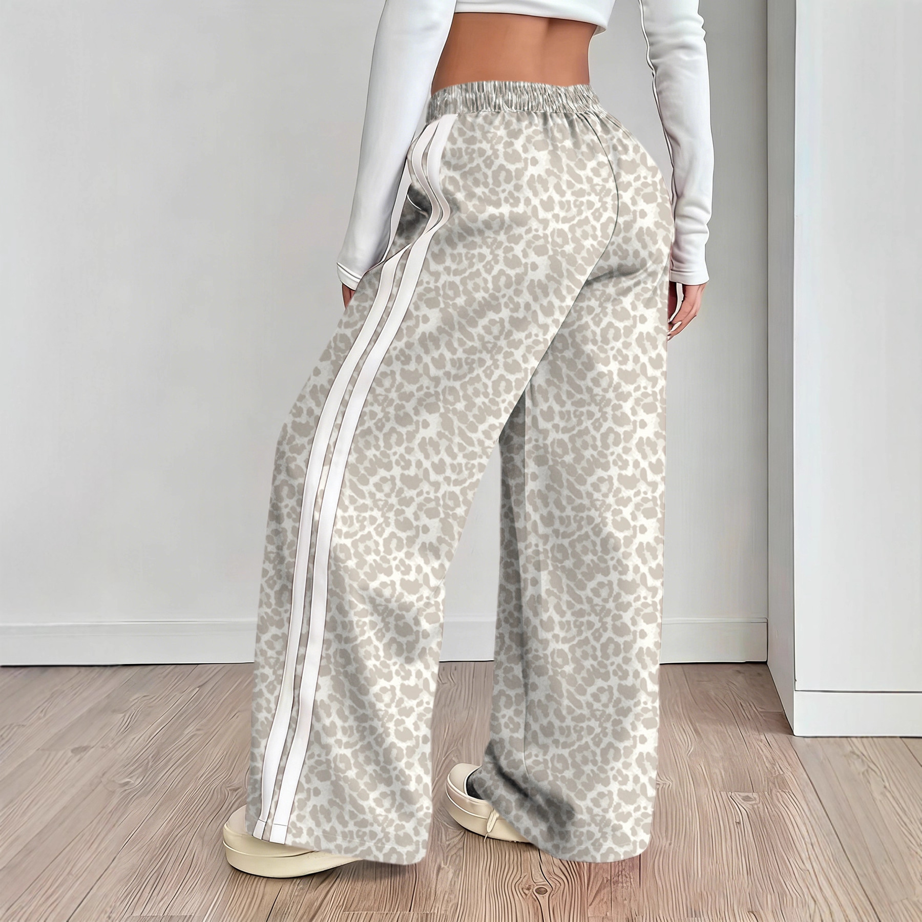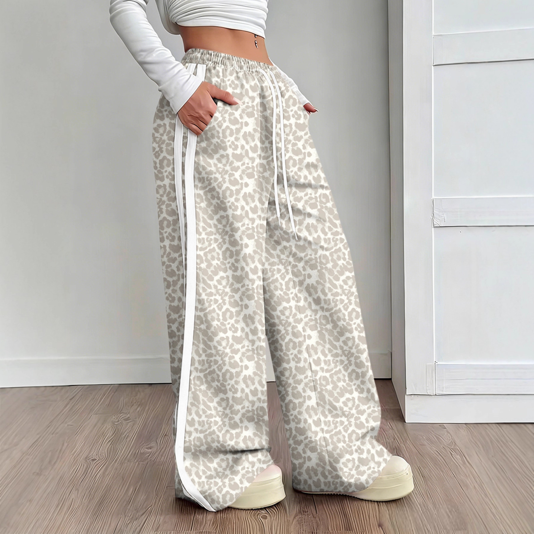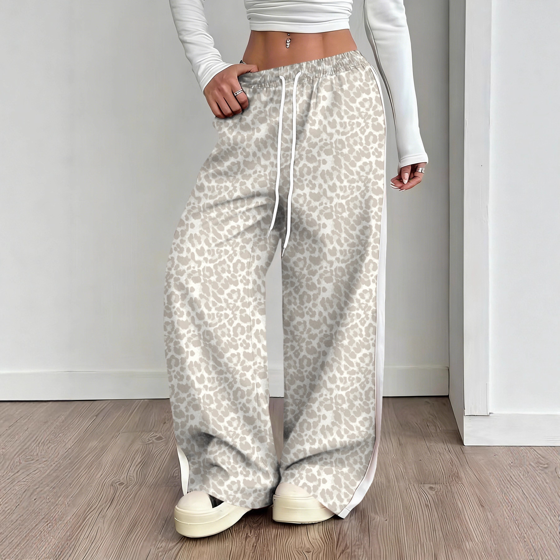 Stylish Leopard-print Patchwork Wide-leg Pants With A Relaxed Flowy Fit